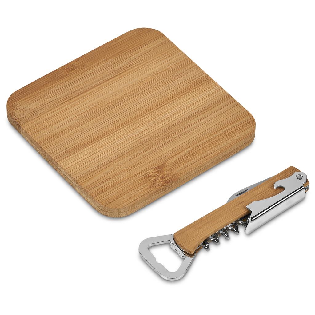 • large front pocket with bamboo cheese board and tool with corkscrew, bottle opener and cheese knife