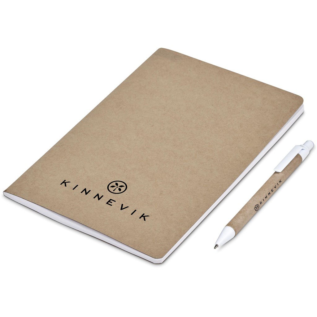 An eco and budget-friendly notebook and pen set, especially suited for meetings, conferences and events. Packaging the notebook and pen in a pouch makes it easy to transport and to distribute these writing sets. This set consists of an A5 notebook with a natural kraft paper cover, and a pen with a sturdy kraft paper barrel. The pouch has a stud button closure, and it’s made predominantly from recycled material.