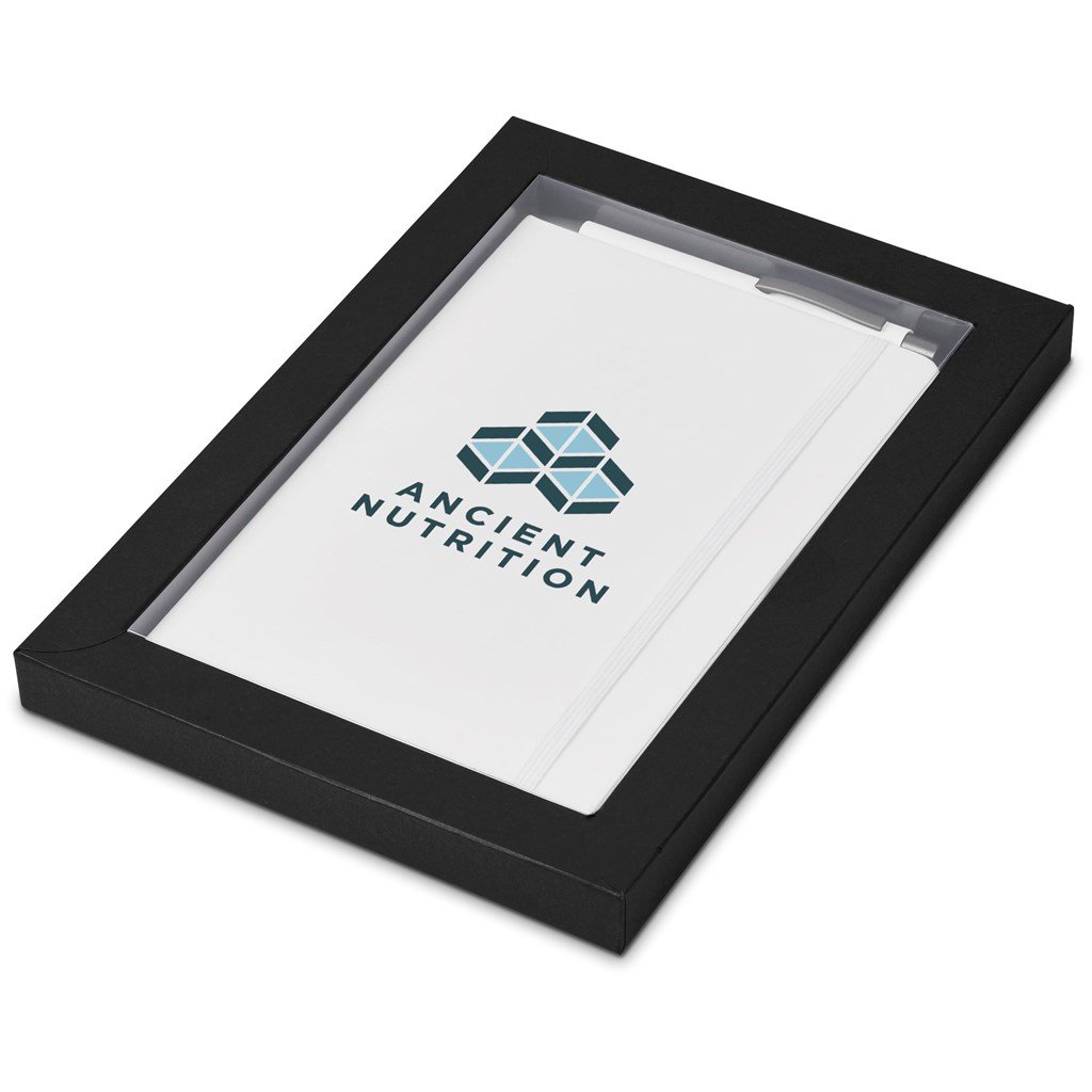A matching Omega A5 Hard Cover Notebook and Ball Pen are packaged together in a box which provides bright and clear exposure for your branding. The box has a firm cardboard base, and a transparent acetate lid.