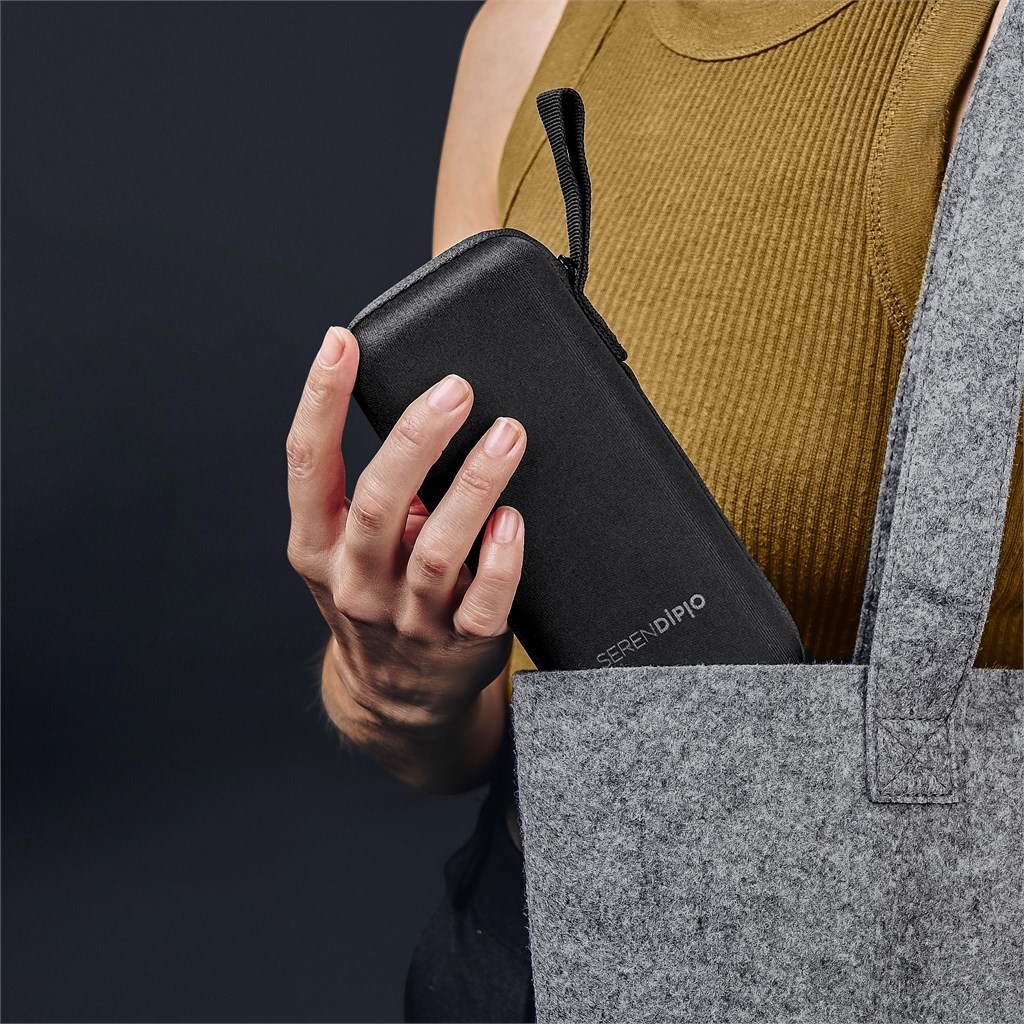 An ultra-compact umbrella in an EVA pouch. It slips easily into a bag, so it’s a good option for everyday use or travel. The recycled PET material is made from recycled plastic bottles, making this a more sustainable product.