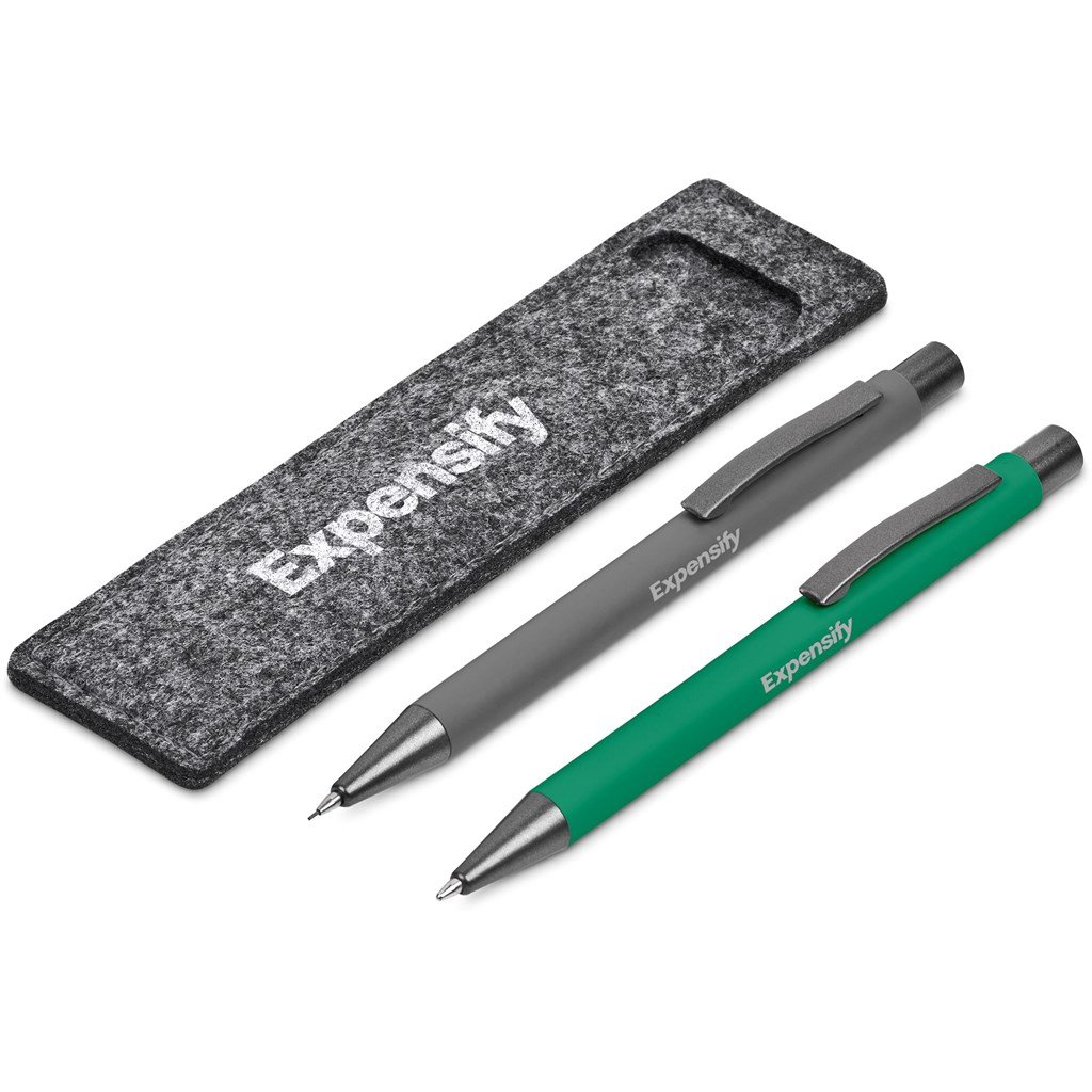 A grey metal pencil and a metal pen in a choice of colours are paired together in a grey pouch made from RPET felt. Laser engraving on the rubberised finish barrel of the pen and the pencil provides a clean precise effect which is both subtle and visible. The ball pen refill contains good quality, black German ink and will provide smooth, uninterrupted writing for a minimum of 1,500 metres. The pencil is fitted with break-resistant 0.5mm lead. A set with a different colour pen and pencil makes it easier to instantly identify which is the pen and which is the pencil.