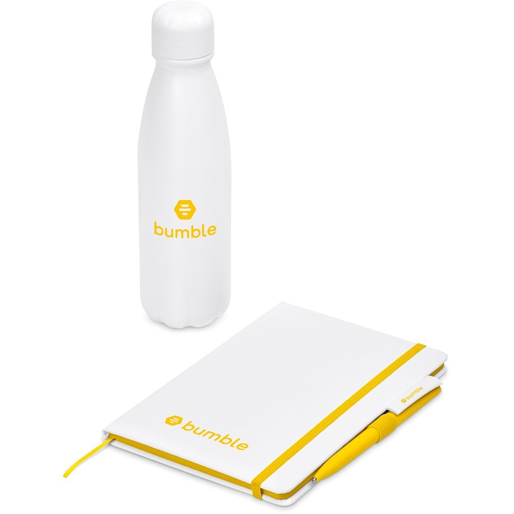 An aluminium bottle, a notebook and a plastic ball pen are neatly presented together in a gift box. This set is suitable as a client gift, or for staff and onboarding of new members to the team. A pre-packaged gift set not only looks impressive, but can also be a convenient and practical option when it comes to transport and delivery.