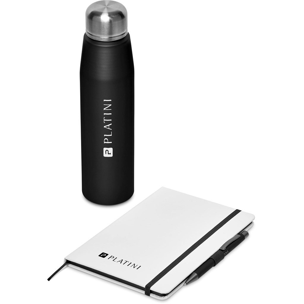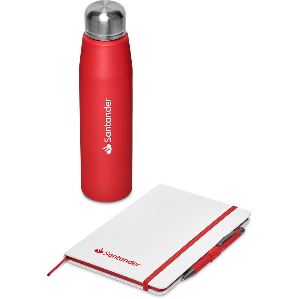 An aluminium bottle with a rubberised finish, a notebook and a ball pen are neatly presented together in a gift box. The pen has a matte finish and reveals a matte white finish when lasered. The notebook features a white cover with colour trims and page edges. This set is suitable as a client gift, or for staff and onboarding of new members to the team. A pre-packaged gift set not only looks impressive, but can also be a convenient and practical option when it comes to transport and delivery.