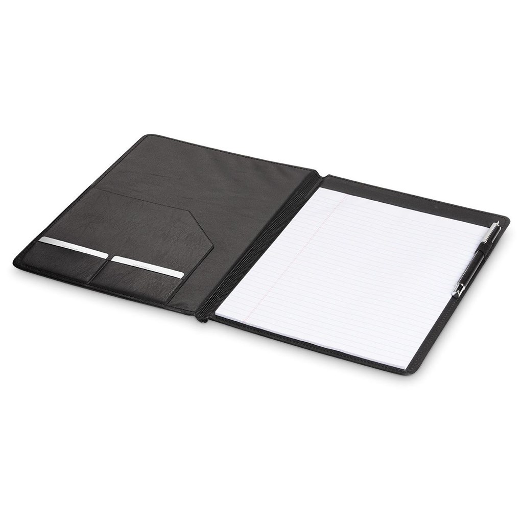 This slim folder has a pebble grain PU surface on the outside and features a document slot, 2 card slots and a pen loop on the inside.