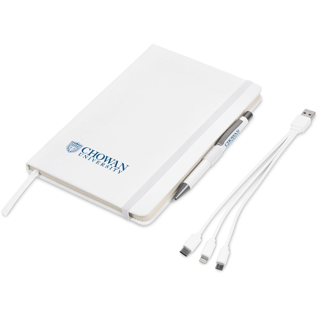 An A5 hard cover notebook, a metal ball pen and a 3-in-1 charging cable are combined in a black, 2-piece presentation box.